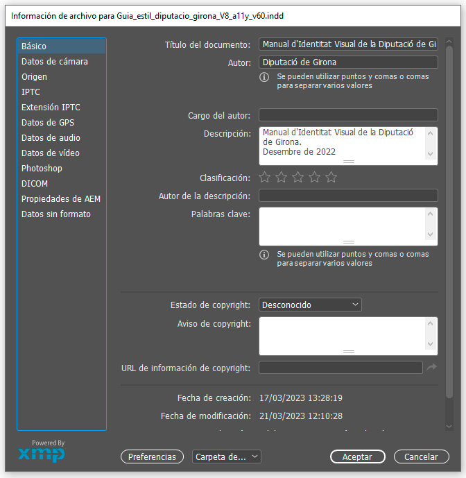 Proporcionar un títol i una breu descripció del contingut ajudarà les persones a identificar el document. Aquesta informació s'emmagatzema a les metadades del fitxer a les quals es pot accedir mitjançant un programari d'assistència o des de les propietats del document d'Acrobat. Les metadades s'han d'afegir al diàleg Informació del fitxer d'InDesign.