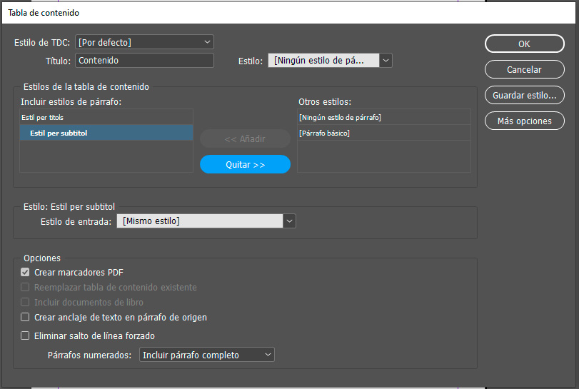 Una taula de continguts generada a InDesign pot afegir marcadors automàticament quan l'opció Crea un marcador PDF està seleccionada al diàleg Taula de continguts.